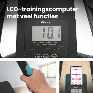 - Trainingscomputer: scan, tijd, puls, snelheid, afstand, calorieën, totale afstand (ODO) — met tablethouder