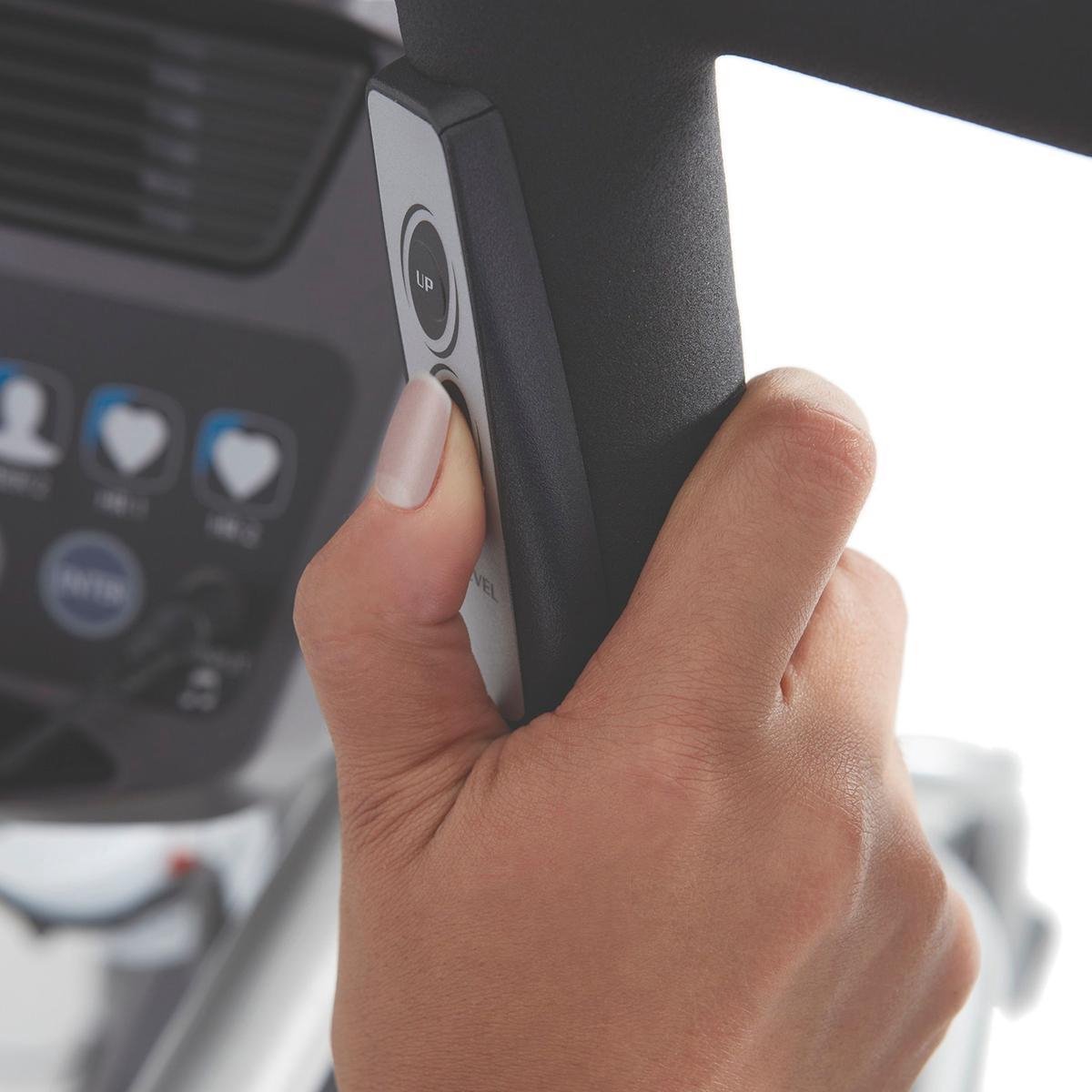 - Intuïtieve bediening: De console heeft een opvallend blauw-blacklight LCD-scherm dat helder en makkelijk af te lezen is. Bedien de weerstand en helling direct vanaf het stuur, en pas de pedaalpositie aan voor comfortabel trainen.